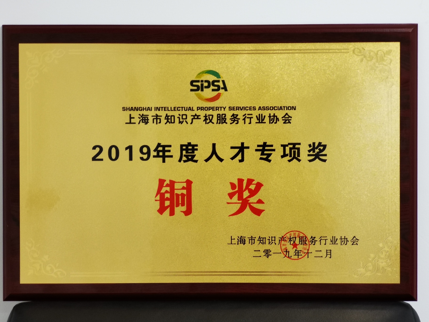 此外,在本次年会中,我公司分别获得了协会颁发的“优秀会员单位奖”和“人才专项奖”,肯定了我们智信在过去一年中的工作表现以及在人才培养方面的成绩,智信也将一如既往的默默耕耘,为上海的知识产权发展作出一份应有的贡献。